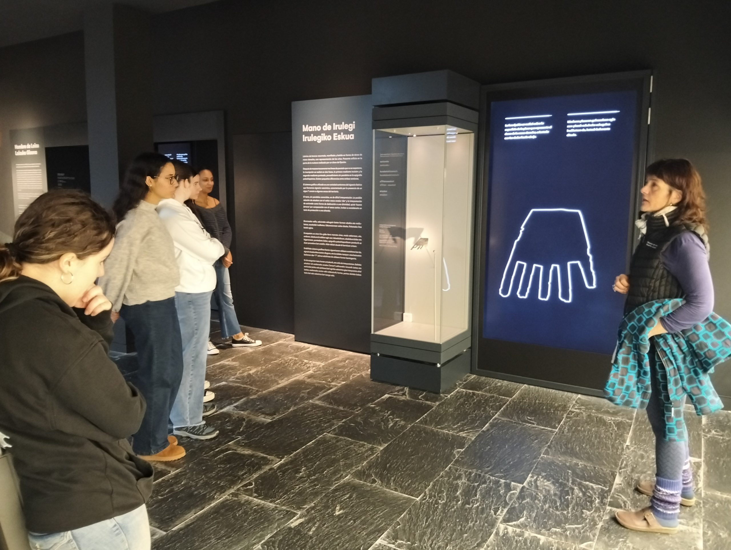 A continuación nos adentramos en el salón de la Prehistoria y la Protohistoria, donde nos centramos en tres elementos principales: el mapa de Abauntz, un canto de piedra calcarenita, datado en el 9815 a.C., que representa un mapa ejecutado de forma sintética y esquemática; el hombre de Loizu, uno de los especímenes humanos más completos del mundo para analizar las últimas poblaciones de cazadores-recolectores; y la mano de Irulegi, objeto procedente de en una aldea vascona del siglo I a.C.Finalmente, visitamos la estatua tocada de una niña de Pompelo, escultura romana de bronce descubierta en 1895 en la calle Curia. En definitiva, tuvimos la oportunidad de dar un buen repaso tanto a la Prehistoria como a la época de los Vascones y la romanización trabajadas previamente en las aulas.