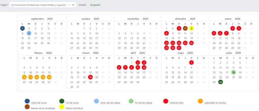 - Comienzo, 4 de septiembre, y final, 18 de junio, del periodo lectivo. FP comienza el 9 de septiembre.