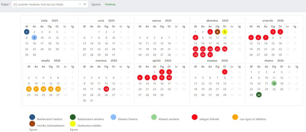 Honekin batera ikasturte honetarako Hezkuntza Departamentuak onartu duen egutegia. Honako datak azpimarratuko ditugu: